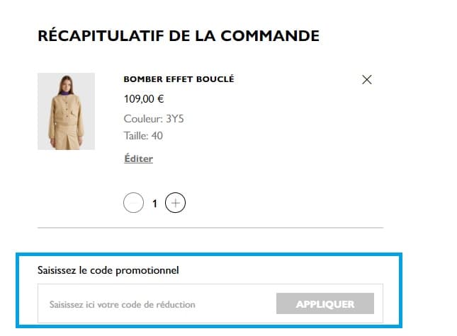 - Lorsque tout est en ordre, recherchez la case intitulée "Saisissez le code promotionnel" sur la page de paiement. Collez votre code avantage United Colors of Benetton dans cette case et assurez-vous qu'il est correctement appliqué avant de finaliser votre achat.