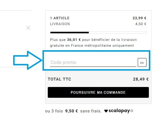 - Lors de la validation de votre commande, repérez le champ dédié aux bons de réduction, intitulé “Code promo”.