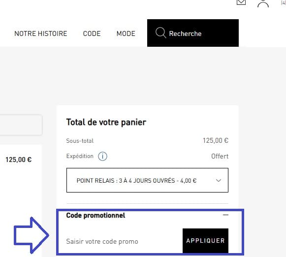 - Une fois vos articles choisis, allez dans votre panier et repérez la case “code promotionnel”.