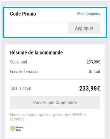 - Collez votre code de réduction VEVOR dans ce champ et assurez-vous de l'appliquer avant de passer au paiement.