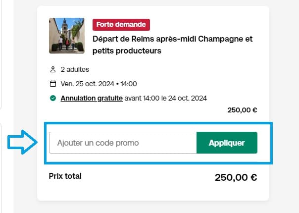 - Et avant de finaliser votre paiement, recherchez la case intitulée "Entrer le code promotionnel" et entrez votre code de réduction Viator. Validez ensuite la réservation pour appliquer la réduction.