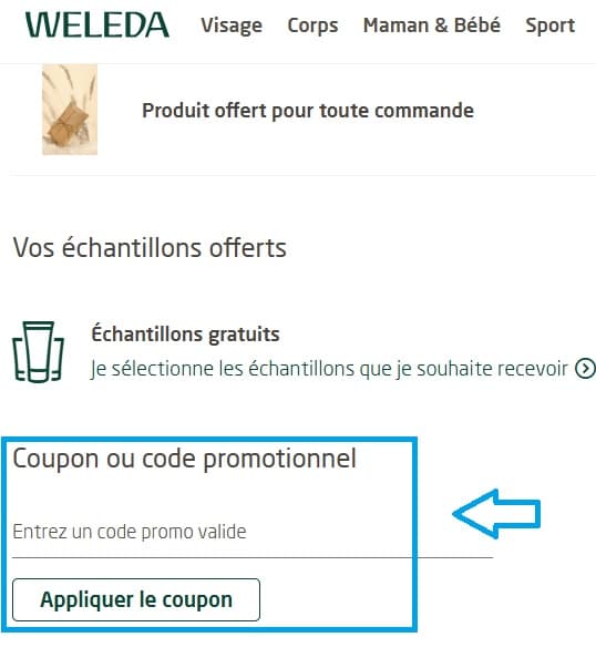 - Repérez le lien indiquant “Coupon ou code promotionnel” et collez votre code promo Weleda dans cet espace.
