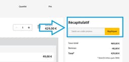 - Dans le panier, repérez le champ "Saisir un code promo ?". Puis, entrez votre code promotionnel Whirlpool dans ce champ et cliquez sur "Appliquer" pour que la réduction soit appliquée.